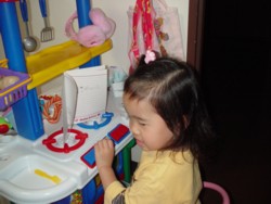 幼稚園の先生を真似て遊ぶ2人の姿は